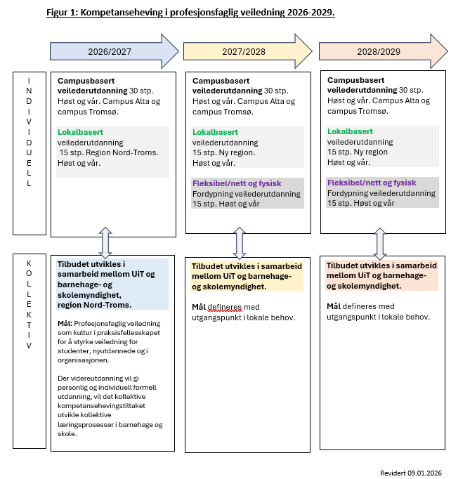 Tilby og gjennomføre lokalbasert veilederutdanning for lærere i barnehage, grunnskole og videregående opplæring. Samlingene foregår i studentenes nærmiljø. Studiesenteret tilbyr lokale og støtte i arbeidet mellom samlingene. Utdanningen sees i sammenheng med tiltak for kollektiv kompetanseutvikling for å styrke profesjonsfaglig veiledning som kultur i utviklingsarbeid i opptil to barnehager og opptil to skoler, avhengig av tiltaksmidler fra Statsforvalter (se figur 2). Evaluering underveis og etterpå. Studenter i veilederutdanningen og deltakere i kollektiv kompetanseutvikling vil få mulighet til å bidra til forskning på innhold og organisering av utdanningstilbudet.