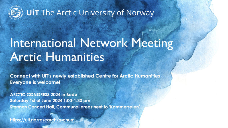 The Centre for Arctic Humanities organises an international network meeting during the Arctic Congress in Bodø. Everyone is welcome. The meeting gives a possibility for scholars working within the Arctic Humanities to connect with UiT's newly established Centre for Arctic Humanities and express their interest in collaboration. The meeting will take place on Saturday the 1st of June 2024 from 1:00 to 1:30 pm in the communal areas next to 'Kammersalen' in Stormen Concert Hall. (LM)