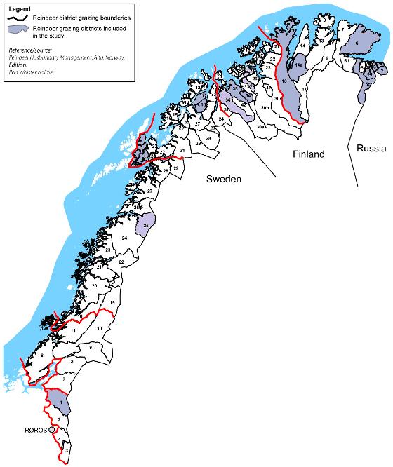 The project used samples from 131 reindeer from 14 grazing areas in four counties (Finnmark, Troms, Nordland and Sør-Trøndelag) in northern and central Norway. The samples were collected in two periods, 2004-2005 and 2008-2009. Most of the samples came from reindeer from Finnmark because Finnmark has the most reindeer grazing areas in Norway.