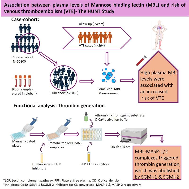The complement system, a fundamental part of humoral and innate immunity, has gained considerable attention for its interplay with coagulation and potential role in the pathogenesis of VTE. Mannose-binding lectin (MBL), a pattern recognition molecule circulates in complexes with MBL-associated serine proteases (MASPs) in blood. The MASPs are activated when MBL bind to specific carbohydrate patterns on pathogens or altered host cells and lead to downstream complement activation. In the present population-based study, we found that individuals with high plasma MBL levels had 79% higher VTE risk than those with low MBL levels, and that activated MBL-MASP complexes facilitated thrombin generation independent of downstream complement activation. The results suggest that high MBL levels are a risk factor for VTE partly mediated by direct thrombin generation at the site of venous thrombosis formation. Our findings were recently published and highlighted as a featured paper in Arteriosclerosis Thrombosis and Vascular Biology.