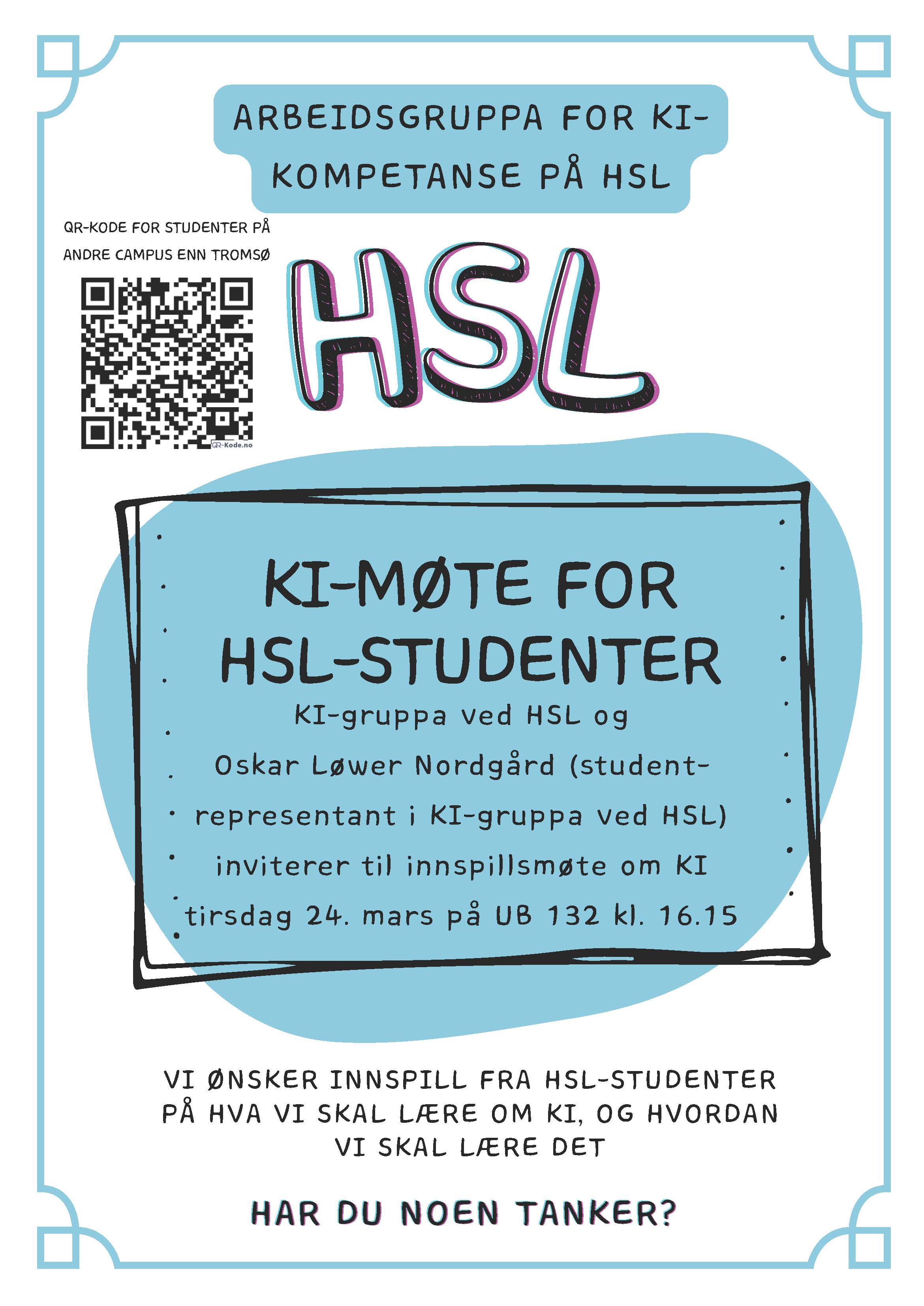 KI-møte for HSL-studenter tirsdag 24. mars kl. 16:15 (bruk QR-koden for å følge møtet på Teams)