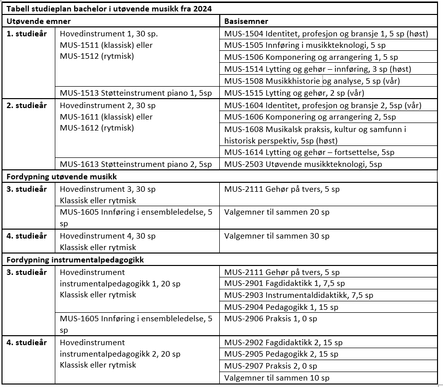 Utøvende emner legger vekt på å gi studentene et solid teknisk og musikalsk grunnlag på sitt hovedinstrument. Basisemnene bidrar til å gi studentene en bred musikalsk kunnskaps- og ferdighetsbase som utvikler forståelsen for musikk, og som gjør studenten i stand til å ivareta ulike oppgaver i yrkeslivet som musiker.